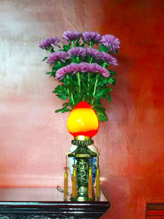 的花瓶和紅燈。鮮花的代表意義是美好,意思就是眾神慈悲,引導天下眾生走向未來的美好。紅燈代表光明,含意就是提醒人只要願意接受神的引導就有希望走向光明。